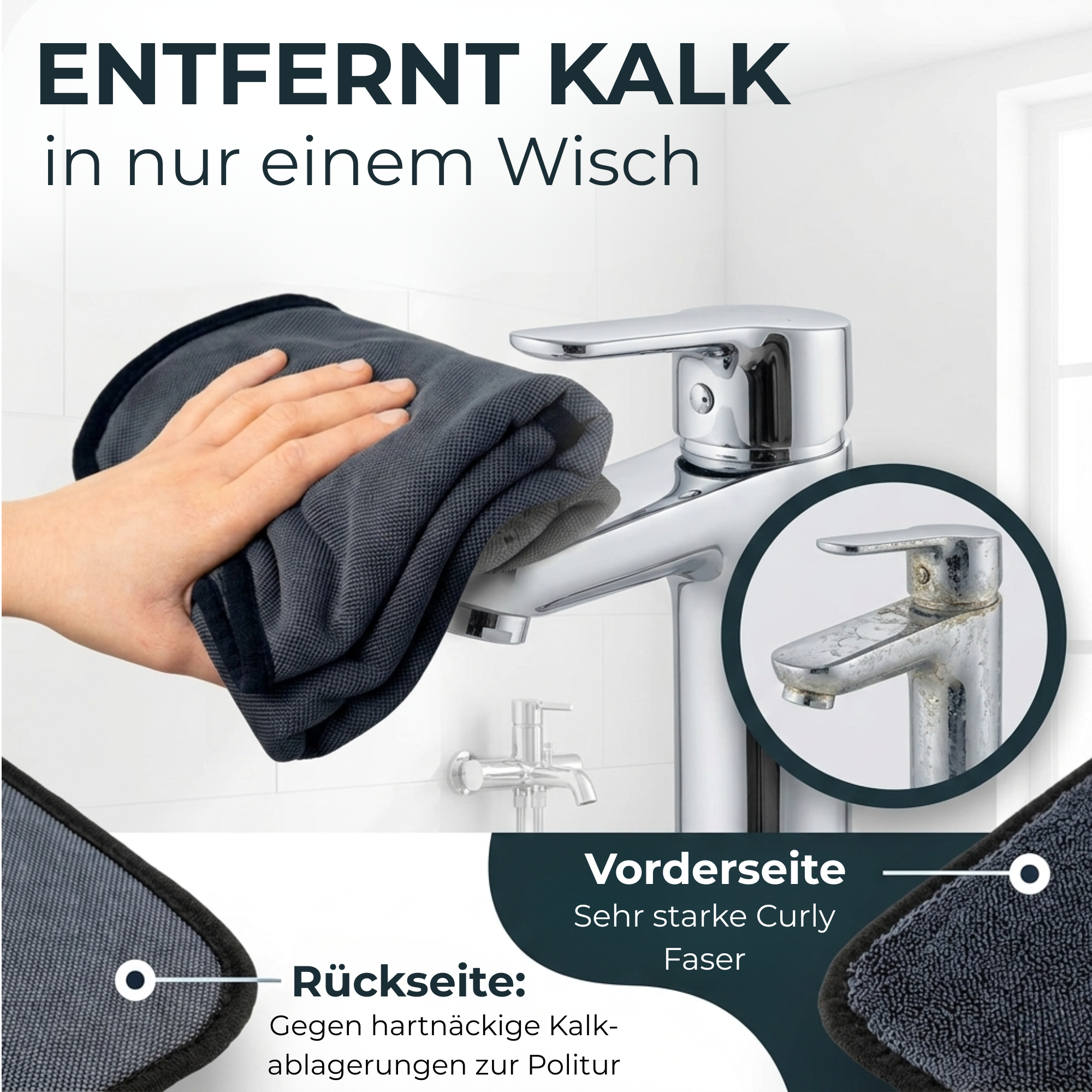 Schone deine Armaturen statt sie zu zerkratzen. Während andere Tücher nur schmieren, arbeitet unser Tuch mit System: Die Rückseite löst hartnäckigen Kalk, die Vorderseite sorgt für ein streifenfreies Finish. So sieht dein Bad nicht nur sauber aus – es glänzt wie am ersten Tag.